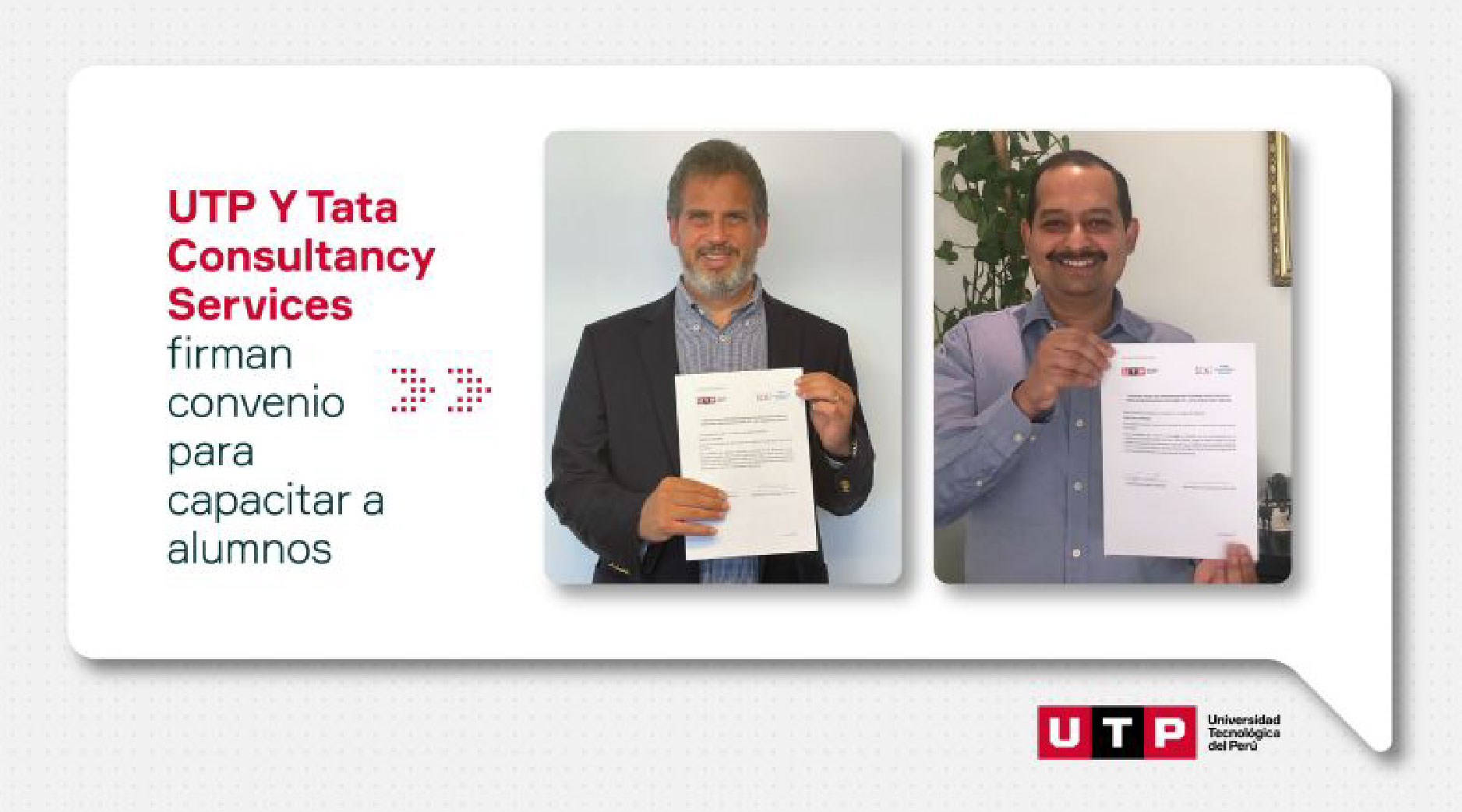 La Universidad Tecnológica del Perú (UTP) y Tata Consultancy Services (TCS), empresa multinacional de consultoría y servicios de tecnología de la información con sede en Mumbai, India, firmaron un convenio de cooperación institucional para desarrollar un programa de entrenamiento intensivo y especializado a favor de los estudiantes de esta casa de estudios.