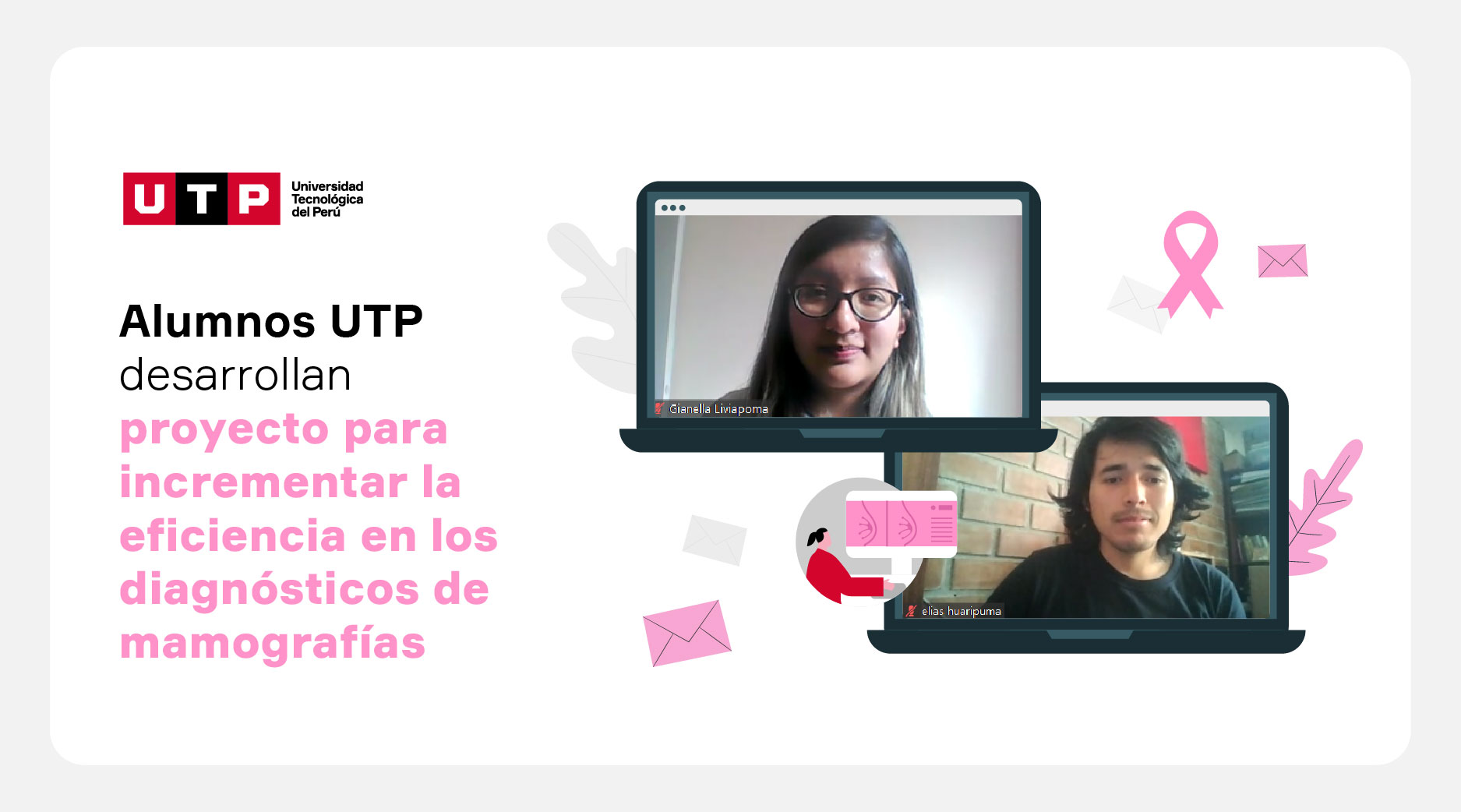 En el marco del Desafío Perú 2021, Gianella Liviapoma, estudiante de Ingeniería Biomédica y Elias Huaripuma, egresado de Ingeniería Mecatrónica, ambos del Campus UTP Lima Centro, presentaron el proyecto “Redes neuronales convolucionales para la detección de tumores en mamografías”. Con esta idea, los jóvenes, quienes conformaron el equipo DENIA (Diagnóstico de Enfermedades Neoplásicas mediante Inteligencia Artificial), se llevaron el primer puesto en el concurso.