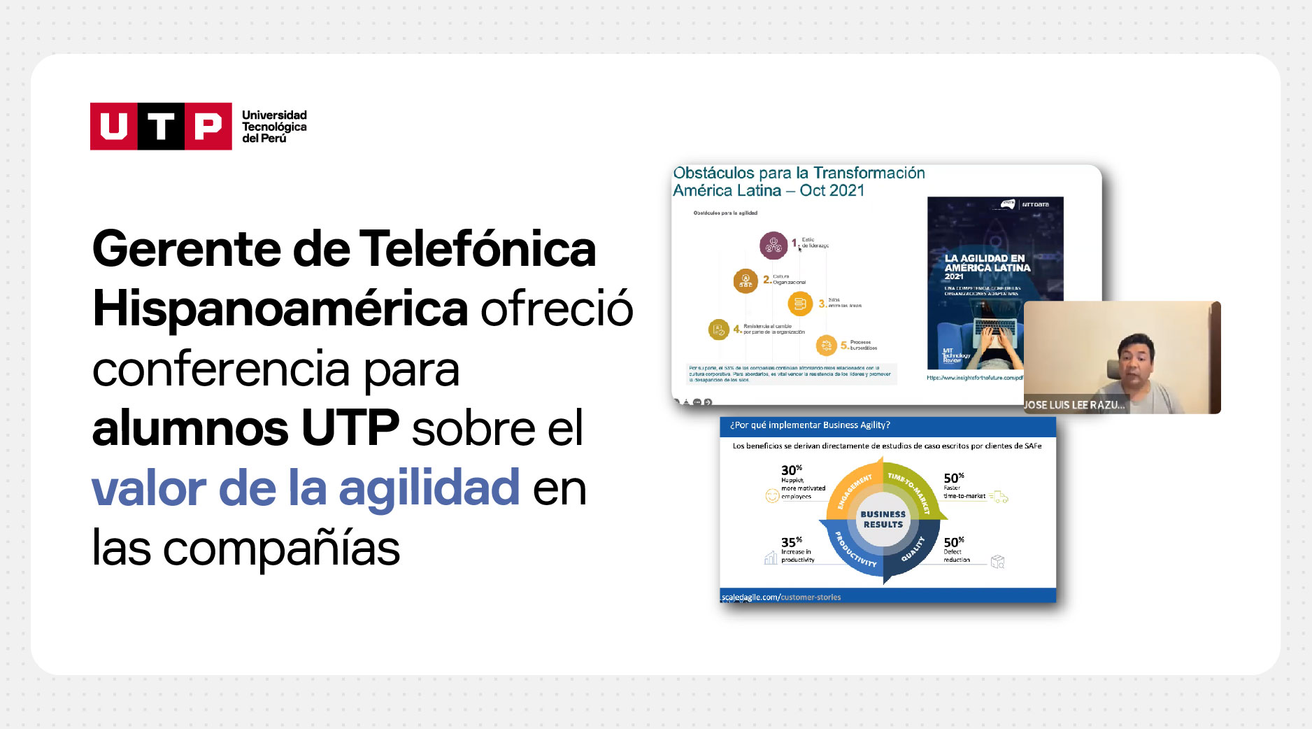 El Campus UTP Piura realizó la conferencia “El valor de la agilidad empresarial” con el fin de conocer la importancia de impulsar la transformación digital en las organizaciones. La charla estuvo a cargo de José Luis Lee Rázuri, gerente de Transformación Agile de Telefónica Hispanoamérica.