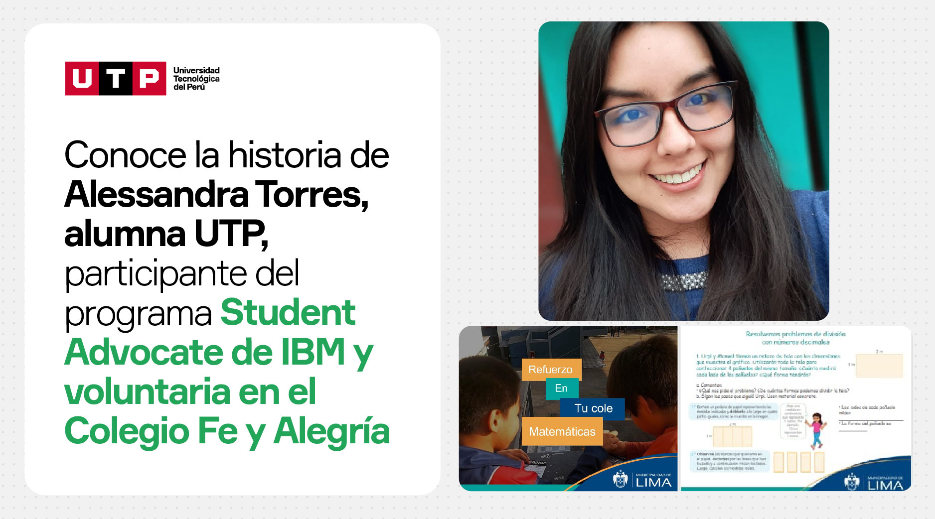 Además, dicta clases a niños de 5to y 6to grado de primaria del colegio Fe y Alegría N°13 de Comas, como parte del Programa "Refuerzo en tu cole" organizado por la Municipalidad Metropolitana de Lima. Este voluntariado tiene como objetivo brindar refuerzo académico en habilidades matemáticas, comunicativas y blandas a escolares. “Me enteré de esta iniciativa gracias a la UTP. Antes de iniciar, los participantes fuimos capacitados en metodologías de enseñanza, habilidades blandas y acompañamiento al alumno. Durante estos meses, me he dado cuenta de la importancia de la educación para el desarrollo de los niños”, agrega.