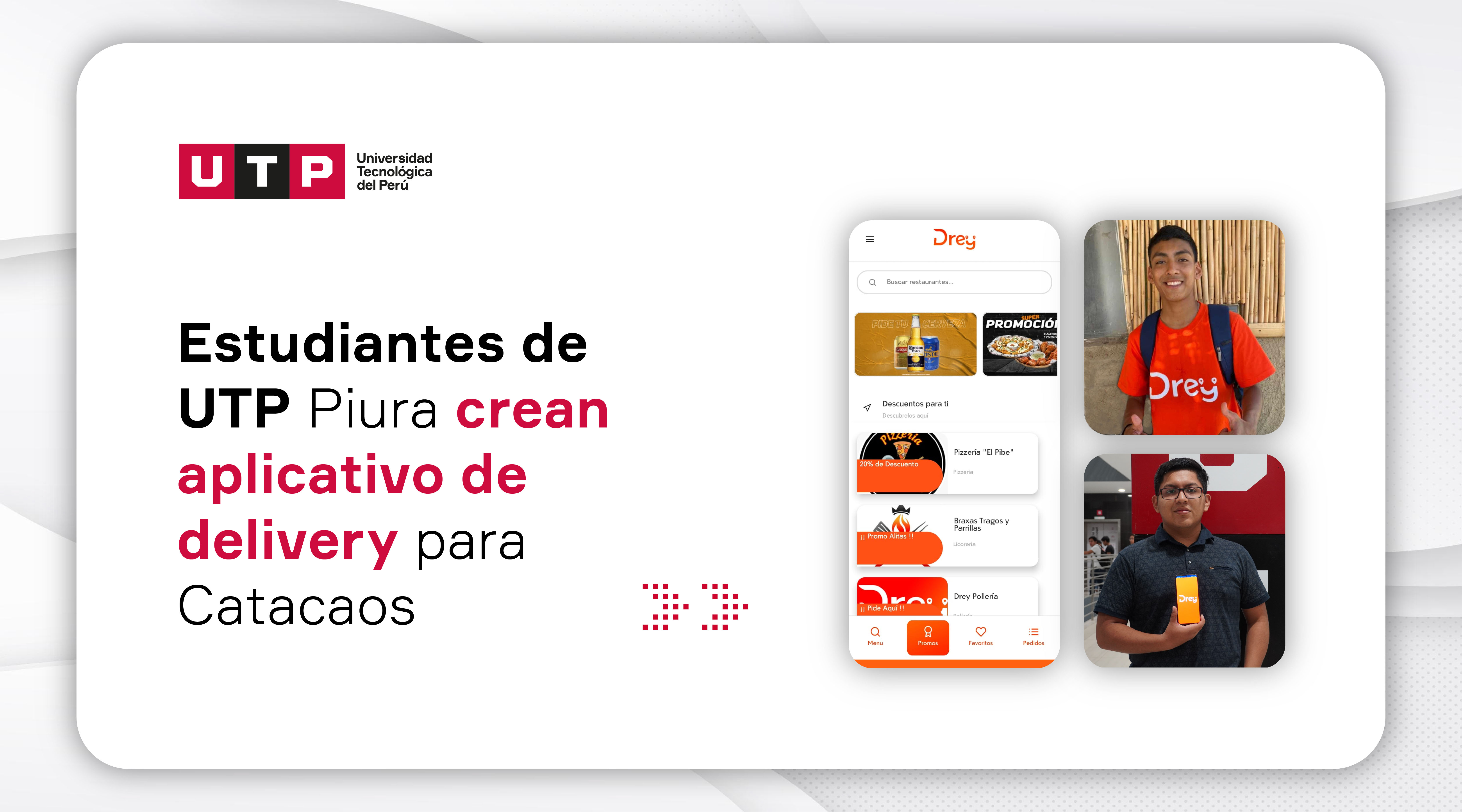 Jonathan Seminario y Antonio Chávez, estudiantes del tercer ciclo de Ingeniería de Sistemas e Informática del Campus UTP Piura, han creado DREY, un aplicativo de delivery disponible en Catacaos.
