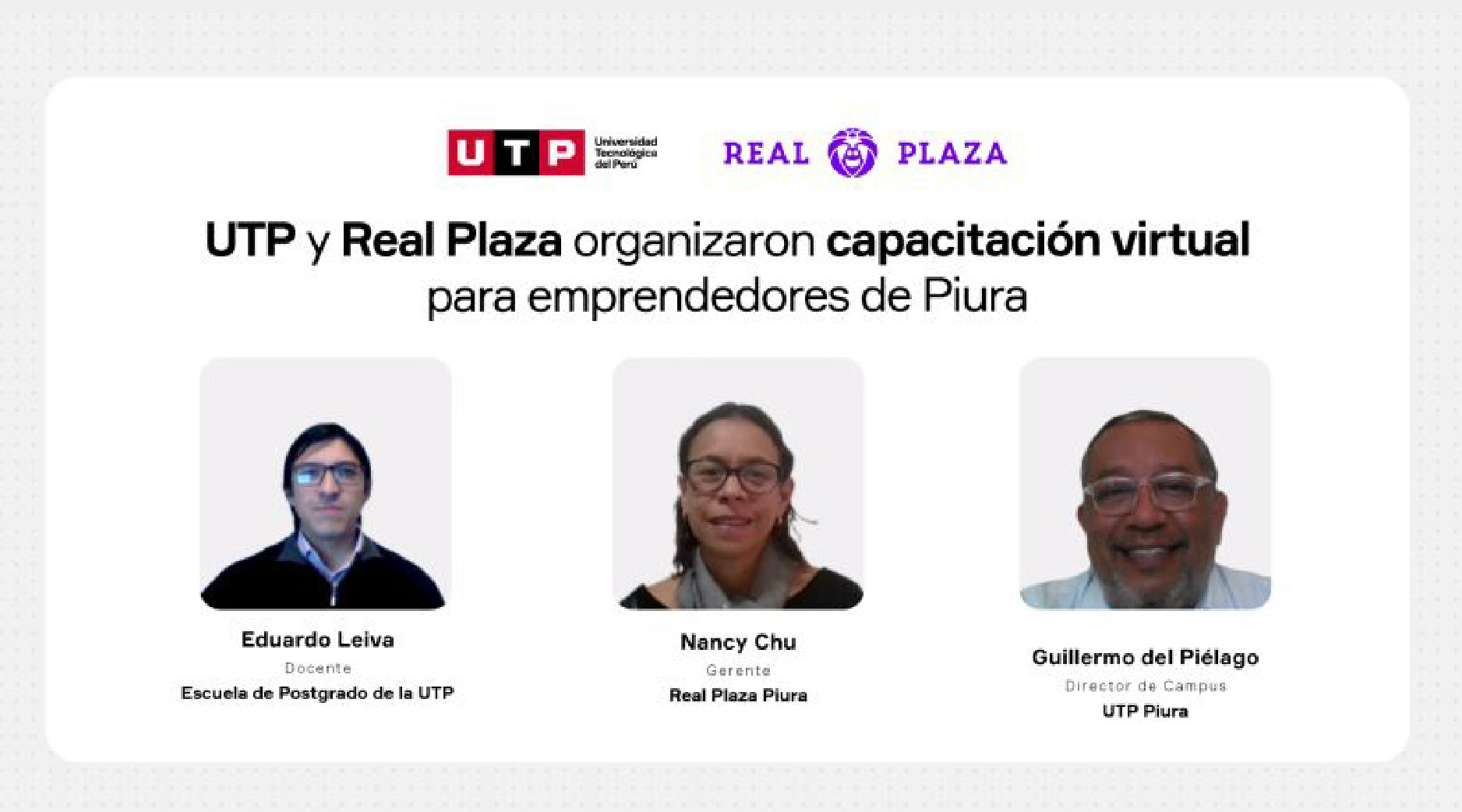 El Campus Piura de la Universidad Tecnológica del Perú (UTP) y Real Plaza de esta ciudad realizaron la capacitación virtual “Cómo desarrollar y potenciar emprendimientos exitosos”, en la que participaron piuranos que cuentan con emprendimientos o con interés en el tema.
