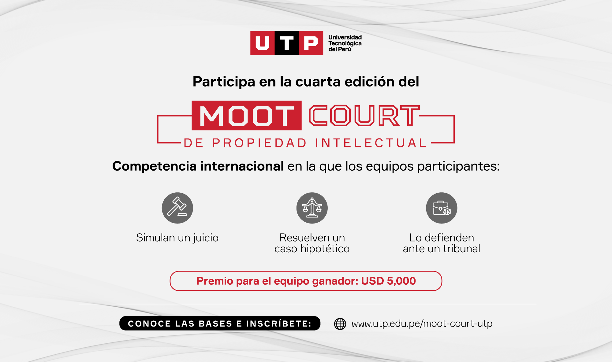 En esta edición de la competencia, el premio para el primer lugar será de 5,000 dólares. Los interesados en concursar pueden inscribirse hasta el 17 de setiembre, ingresando al siguiente enlace: https://www.utp.edu.pe/moot-court-utp