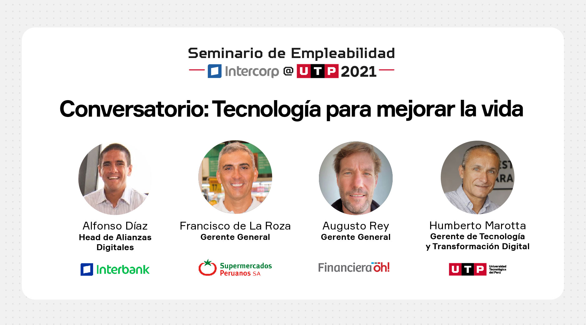 En la charla “Tecnología para mejorar la vida” participaron como panelistas Augusto Rey, gerente general de Financiera Oh, Alfonso Díaz, Head de Alianzas Digitales de Interbank, Francisco De La Roza, gerente general de Supermercados Peruanos, y Humberto Marotta, gerente de Tecnología y Transformación Digital de la UTP.