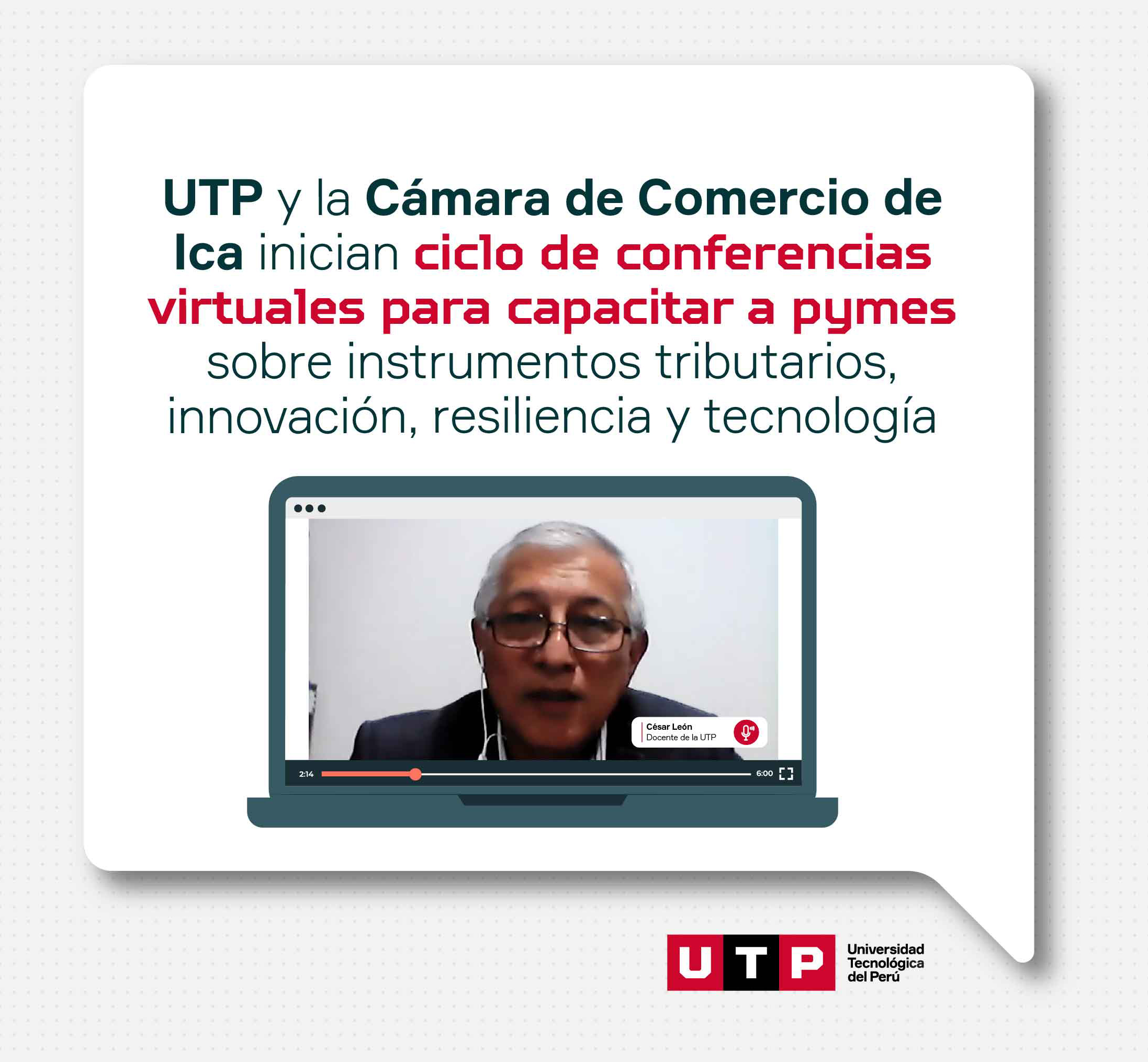 La Universidad Tecnología del Perú y la Cámara de Comercio de Ica vienen desarrollando tres importantes conferencias con la finalidad de brindar herramientas para fortalecer a las pequeñas y medianas empresas en esta nueva normalidad. Los temas de capacitación que se están abordando son: Instrumentos tributarios para pymes, Innovación y resiliencia y Tecnología Pyme.