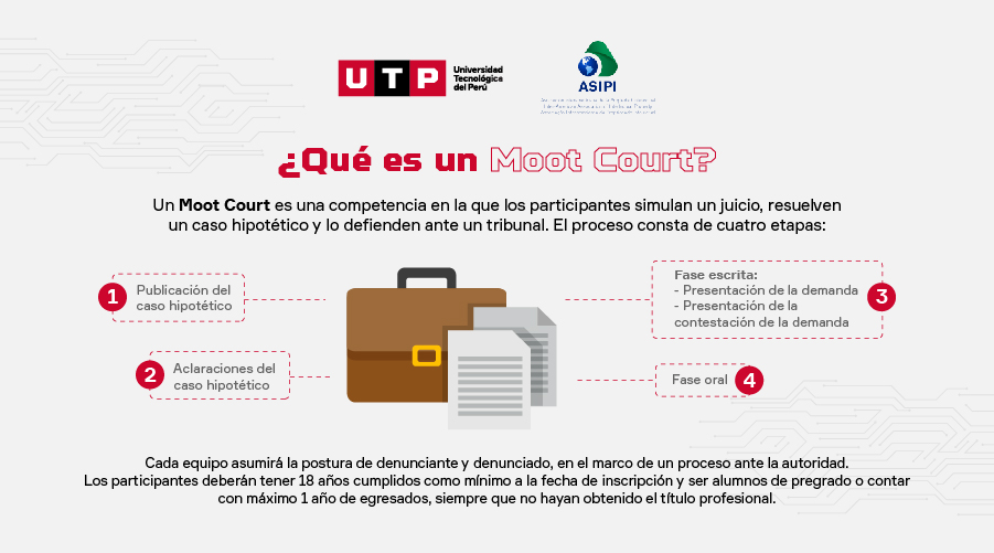 Con el objetivo de reforzar las capacidades de los estudiantes, la Universidad Tecnológica del Perú (UTP) y la Asociación Interamericana de la Propiedad Intelectual (ASIPI) organizan el Moot Court de Propiedad Intelectual. Los interesados en concursar, pueden inscribirse hasta el 30 de setiembre, ingresando al siguiente enlace: https://www.utp.edu.pe/moot-court-utp
